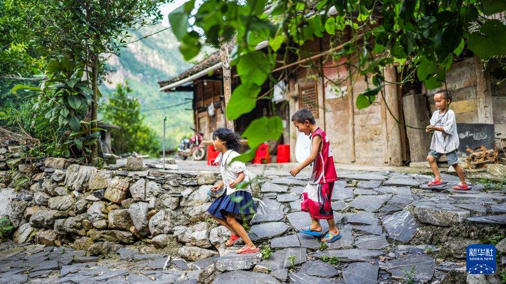 小朋友从天门村一处石板路上经过(7月16日摄)。新华社记者 陶亮 摄