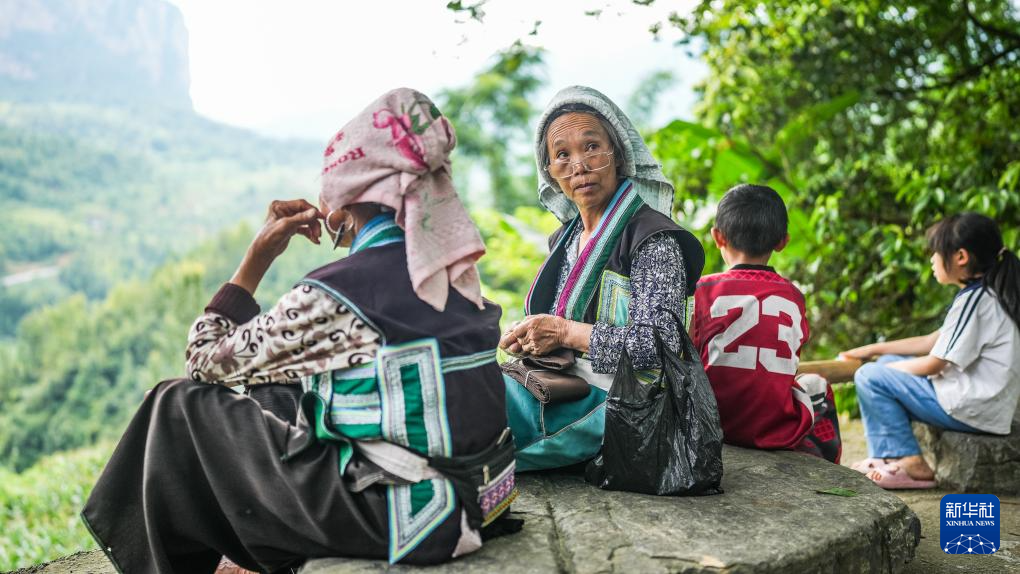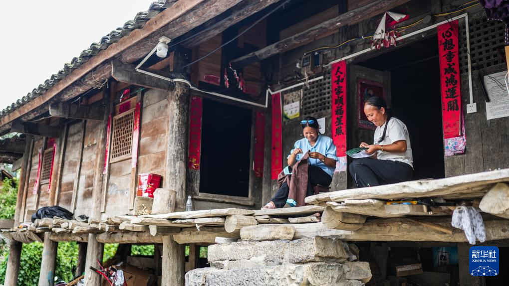天门村村民陆大珍(左)、王兴珍在吊脚楼上制作绣片(7月16日摄)。新华社记者 陶亮 摄