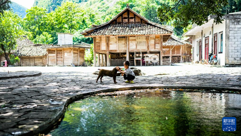 小朋友在天门村和小狗玩耍(7月16日摄)。新华社记者 陶亮 摄