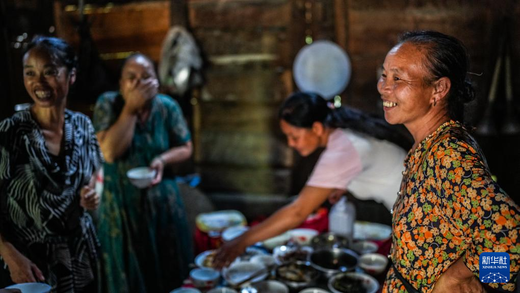 天门村村民陆胜秀(右一)等在家中聚餐(7月16日摄)。新华社记者 陶亮 摄