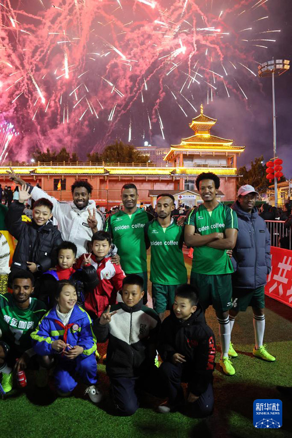 埃塞俄比亚·黄金咖啡足球队赛后与现场观众合影留念。新华社记者 罗羽 摄
