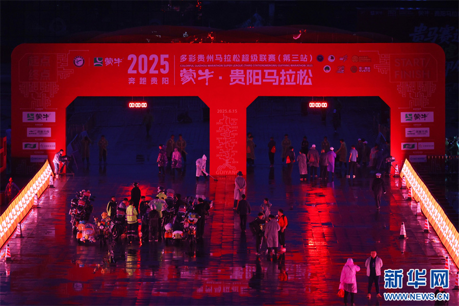 6月15日凌晨,工作人员在贵阳马拉松赛现场作准备工作。组委会供图