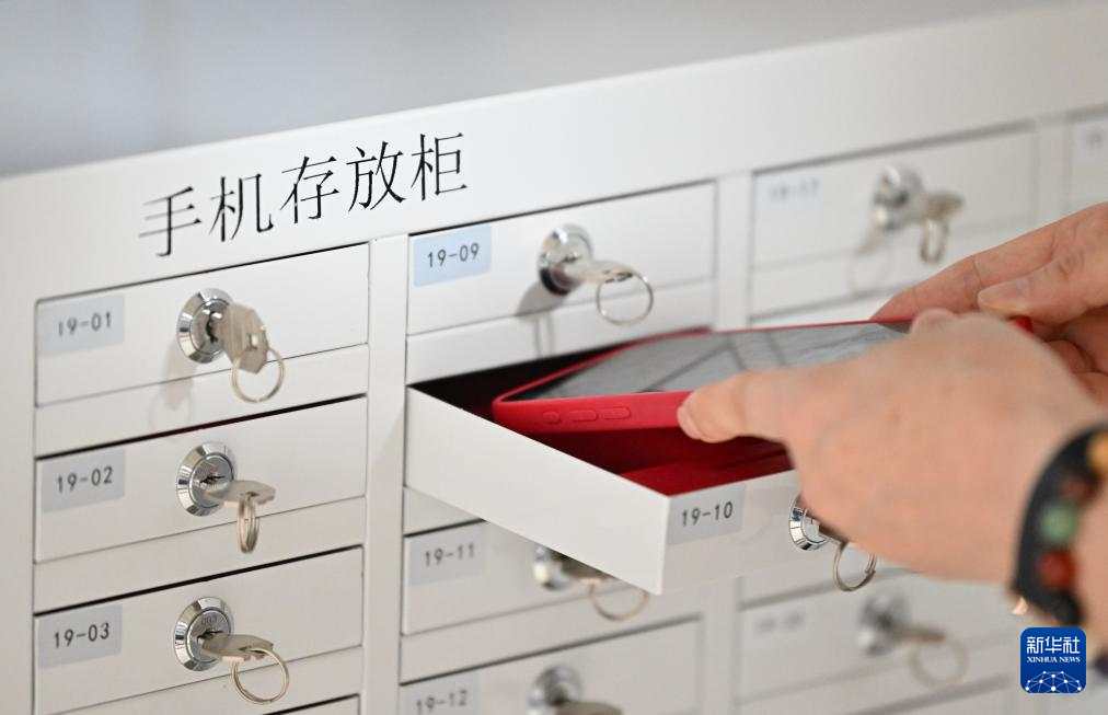6月16日,在天津大学评卷点,工作人员将手机放入存放柜中。新华社记者 李然 摄