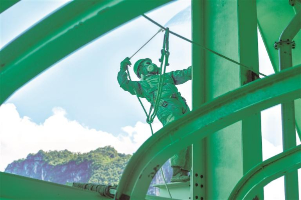 花江峡谷大桥是贵州六安高速公路的控制性工程,全长2890米、桥面距水面高625米,预计今年9月底建成通车。大桥建成后,不仅主桥跨径居山区桥梁跨径世界第一,桥梁高度更是刷新世界纪录,成为“世界第一高桥”。在这“云端战场”,中国“基建狂魔”其实是一个个平凡的身影。他们以山为伴,与风共舞,在常人望而生畏的绝险之地,将每一个螺栓的扭矩值、每一寸焊缝的均匀度、每一道涂装的完美附着、每一处构件的精准定位,都淬炼到极致。(记者 陈慧 李枫 旷光彪)