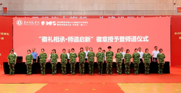 在庄严的国歌声中,开学典礼正式拉开帷幕。会上举行了“徽礼相承·师道启新”徽章授予暨师道仪式,激发新生们作为新师院人的自豪感和归属感。
