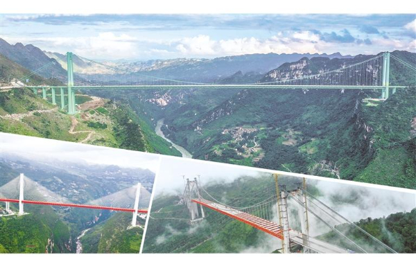 目前世界前三高桥均在贵州,它们分别是:世界第一花江峡谷大桥(上),桥面距水面625米;世界第二北盘江大桥(下左),桥面距水面565米;世界第三天门大桥(下右),桥面距水面560米。(记者 刘青 摄)